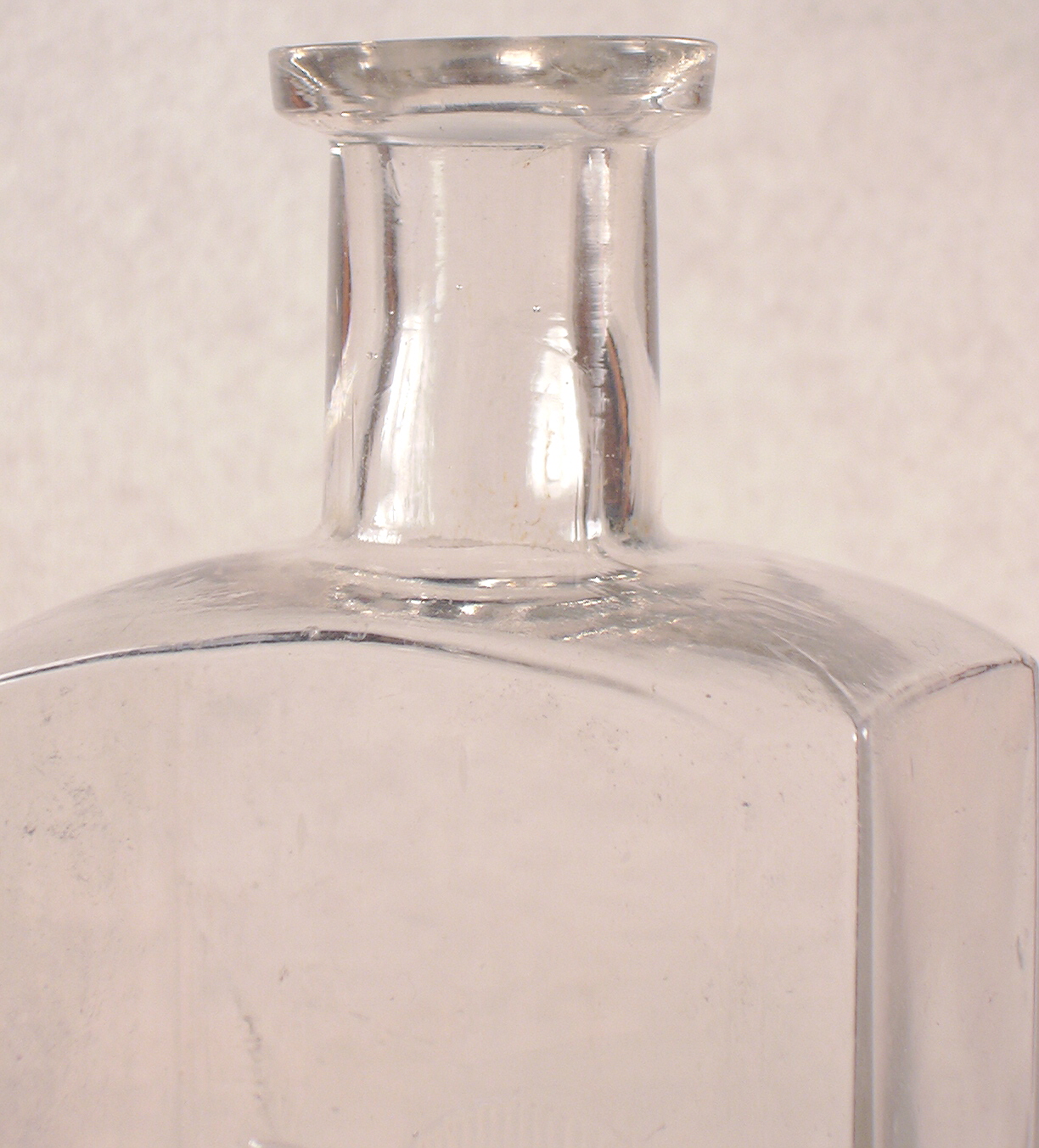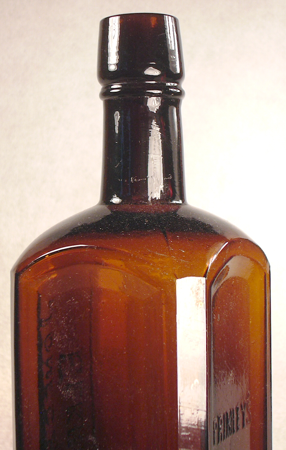 Not much help, but does indicate a likely timeframe for when this bottle was made and used by the still unknown purveyor. The bottle has an applied "oil" finish/lip (click view of the shoulder, neck and lip) and was blown in a post base mold (click base view to see such) which places it generally in the mid-ish 1880s or so. It does have two air venting marks - one each at the top of the beveled edges on the two shoulders without the vertical mold seams. That also is very indicative of a mid to late 1880s bottle given the other characteristics.