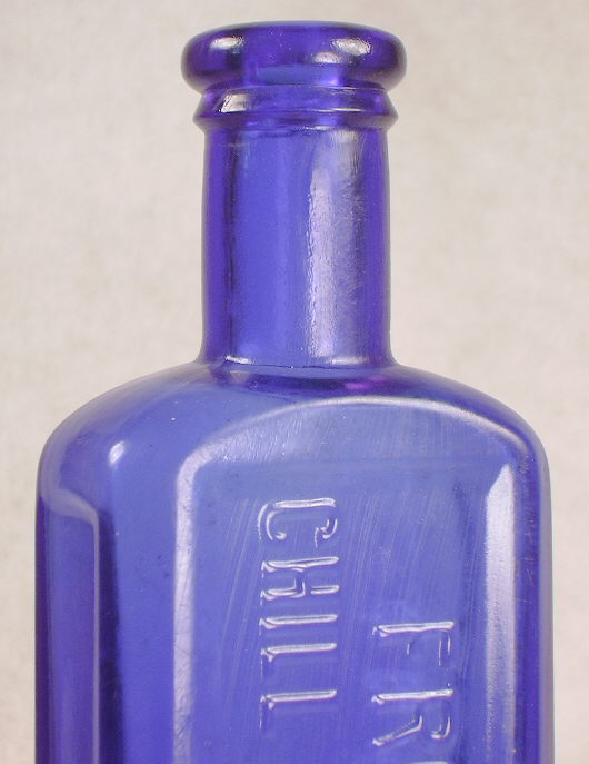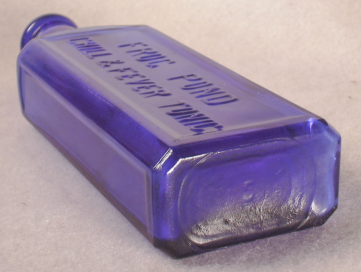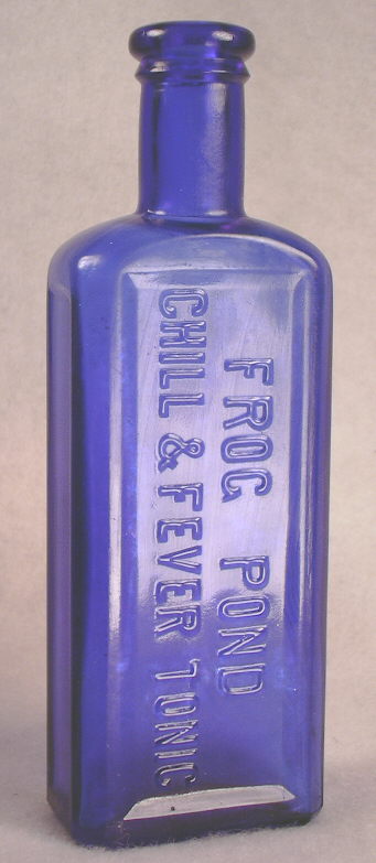 The bottle is actually machine-made, albeit an early one likely dating from the mid to late 1910s; possibly early 1920s? The only history I could find on the bottle online was on the FOHBC website's "virtual museum." See the following link which is more about the slightly older, amber glass FROG POND / CHILL & FEVER CURE which was the precursor product although it does show a picture comparison between that amber cure and the blue tonic. Link to the Frog Pond Virtual Museum article and images. The interesting history of the Augusta, GA. company is found at the Virtual Museum link. It notes that even though the company was forced by the Pure Food & Drugs Act of 1906 to eventually change "CURE" to "TONIC" they still advertized the product as a cure.