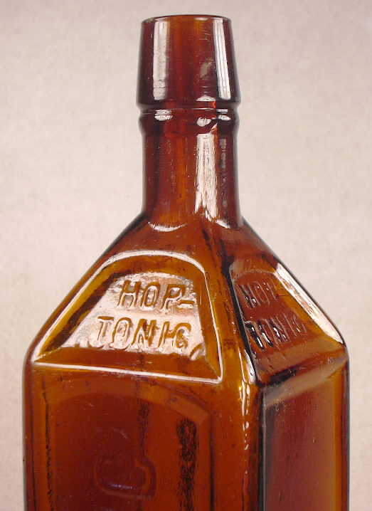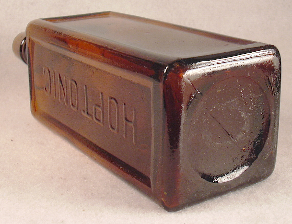These Hop Tonic bottles are odd bottles for a few reasons. First is the panel with the large HOP TONIC embossing is read "left handed". i.e., from the base of the bottle to the shoulder. Such is very unusual with most mouth-blown bottles. Secondly, the bottle was made in a true two-piece mold as indicated by the two opposing vertical side mold seams both dissecting and joining each other on the base of the bottle dissecting it equally. Click base view to see such. That was an early two-piece mold style that virtually disappeared by the early 1870's being replaced by the post-base and cup-base mold styles. Lastly, it has a tooled - not applied - finish which really didn't begin to dominate finishes of mouth-blown bottles until the late 1870s to early 1880s. Click the image to the immediate left to see a larger image which shows the mold seam continuing into the "ring" base of the "brandy" style finish. Those two final attributes make it very hard to date and information on the history of the bottle is seemingly absence from the usual medicine bottle books done over the past 50+ years. (The bottle also has no evidence of mold air venting which didn't become common on mouth-blown bottles until the last half of the 1880s.)