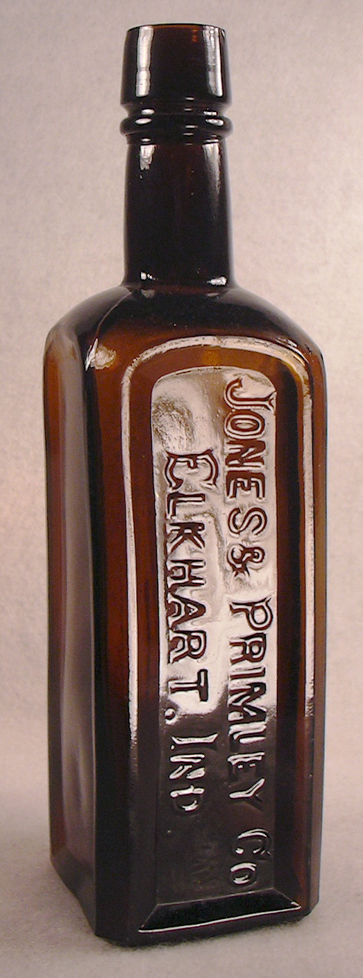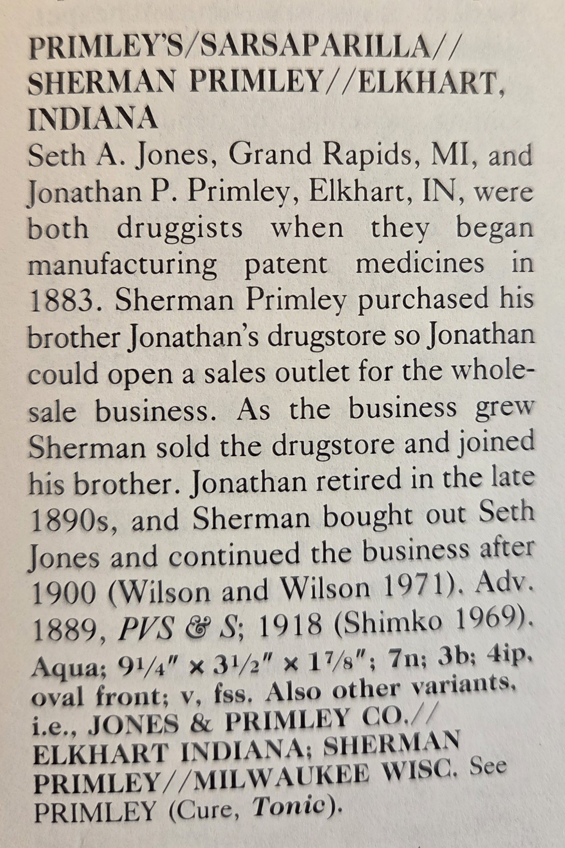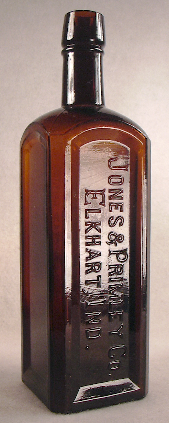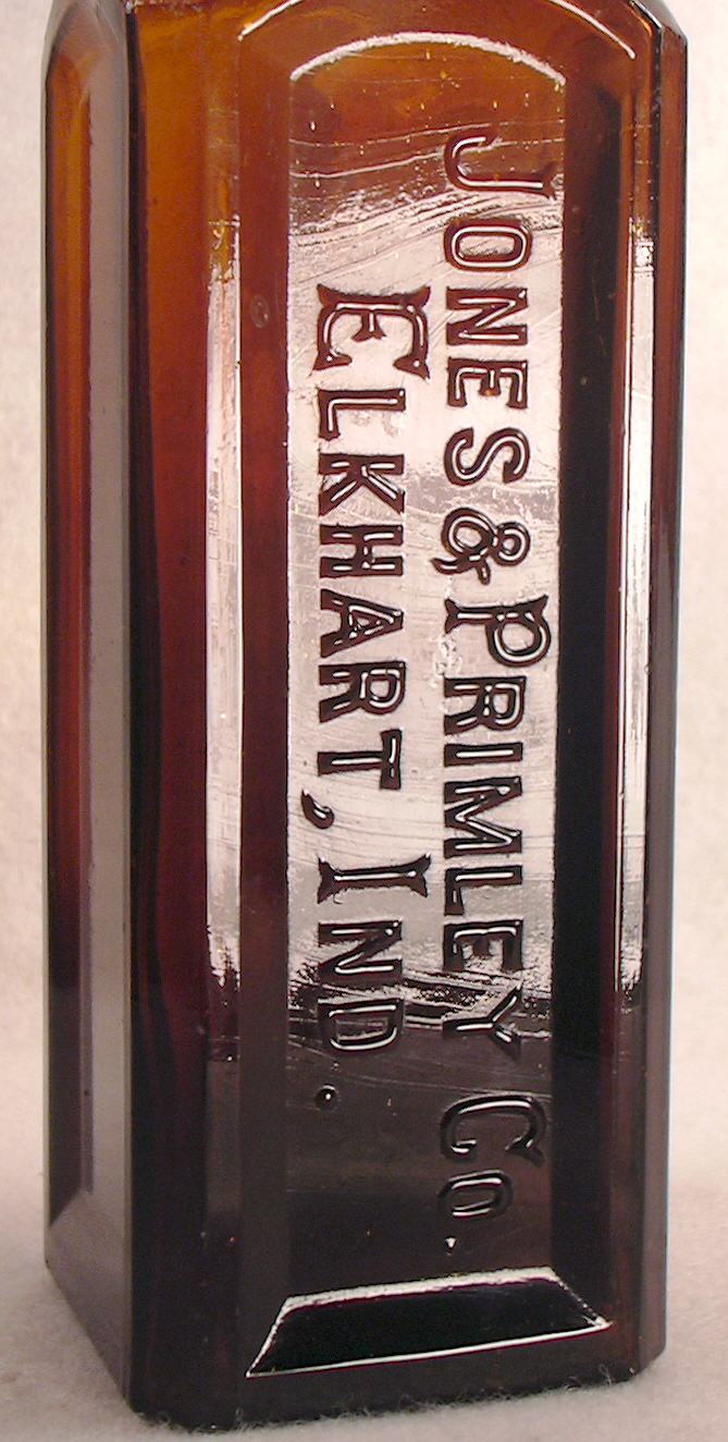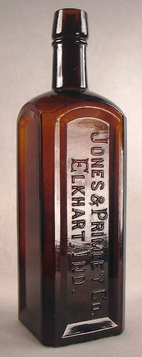 Fike's 1987 "The Bottle Book - A Comprehensive Guide to Historic Embossed Medicine Bottles" has some history about the company in the section on Sarsaparilla bottles. Click Fike page 219 to see such. It notes the (Seth) Jones & (Jonathan) Primley Company beginning producing patent medicines in 1883 and operating under that name until the late 1890s when Sherman Primley (Jonathan's brother) bought out Jones. The two brothers continued the company into the 20th century likely being put out of the patent medicine business in the years after the 1906 Pure Foods & Drugs Act and the subsequent (1912) additions throttling the often wild medicinal claims such companies could ascribe to their products.
