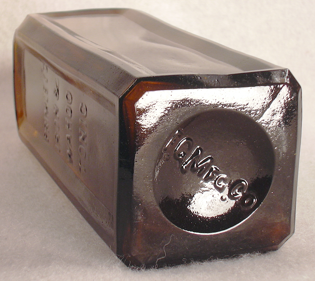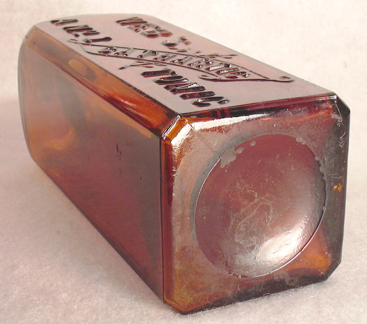 More specifically, the offered bottle is 8.75" tall, 2.5" to a side and has a tooled one part "oil" finish (aka "lip"). Click close-up of the shoulder, neck and finish to see such. The base has a typical "post-mold" circular indentation along with the side mold seams ending opposite each other at the post depressing edge. Click base view to see such. As the images show it is boldly embossed on the sides and the glass a nice bright medium amber. There is no makers marking on the base though it was likely a product of a local glass works, i.e., San Francisco & Pacific Glass Works. (The slightly later/taller example shown in the side-by-side images linked above has P.C.G.W. embossed on the base indicating that it was made at the successor company - Pacific Coast Glass Works - which was formed in 1902.)