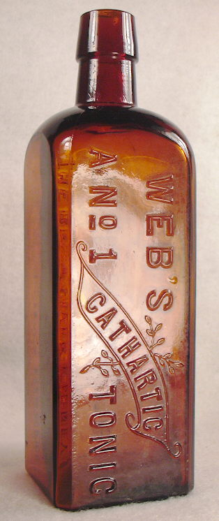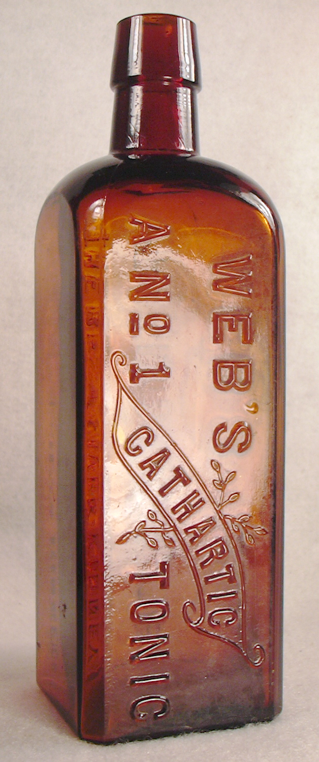 As the images show, the embossed lettering is pretty much the same on the two later bottles (assuming the triangular one is the oldest, though it may not be) but the layout and decorative elements are a bit different. This offered example is almost identical in size and conformation to the Hostetter's Bitters of the same era (1890s to 1910s) which was almost certainly the products main competitor. The slightly bigger third mold example (right bottle in linked images) is almost identical to the Lash's Kidney & Liver Bitters which was first produced by the same company owned by John Spieker and Tito M. Lash in Sacramento, CA. According to the Wilson's 1969 "Western Bitters" both men were in business together until T. Lash split off about 1890. The Web's A No. 1 Tonic was produced by Tito M. Lash in Sacramento as well as "Dr. Web's Bitters" and "Web's Stag Bitters." All were wiped out by National Prohibition in 1920 according to the Wilson's book.