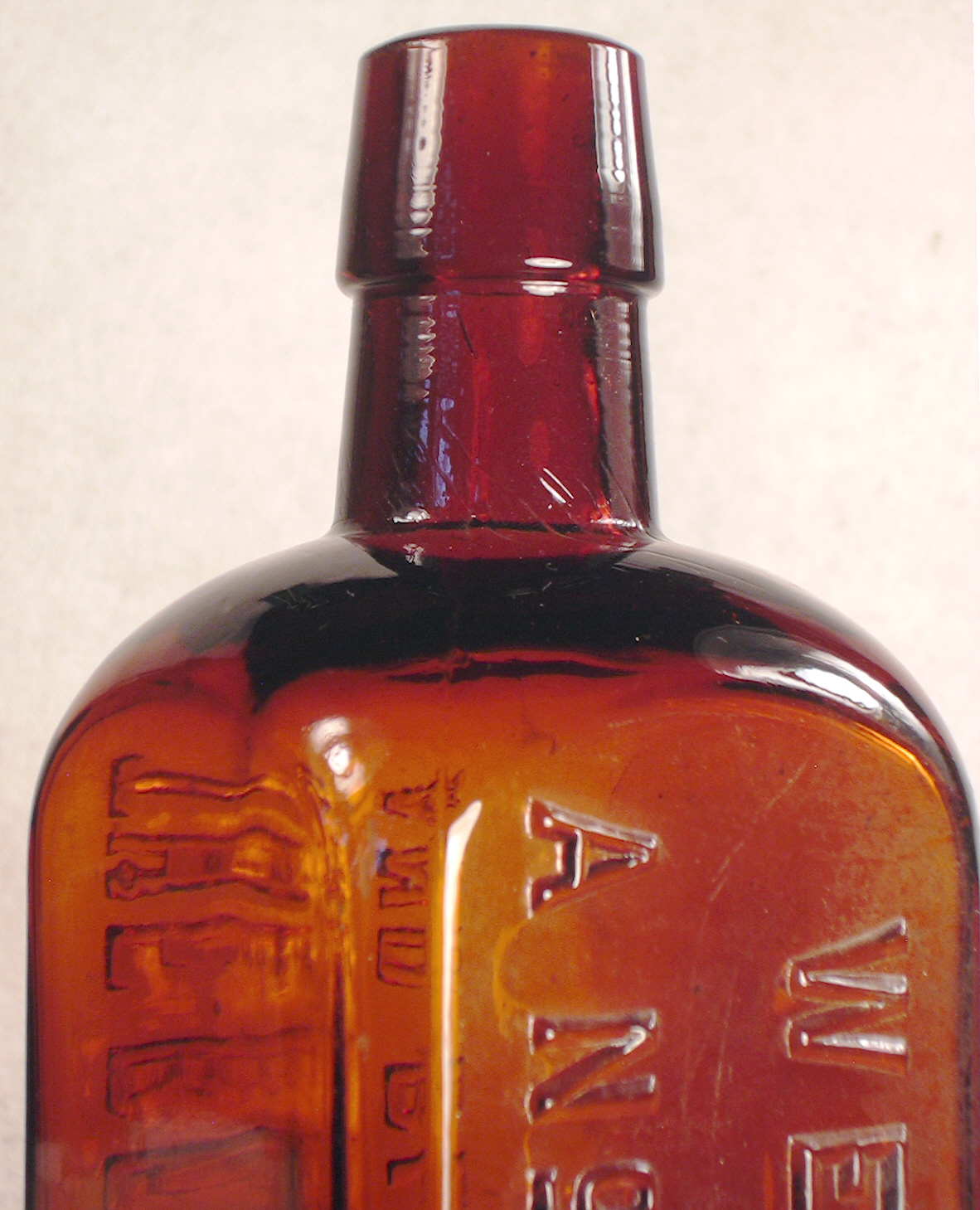 Unfortunately, I don't know where the bottle hails from just that it is certainly an American made product. It is reminiscent of the flask like Dr. Fenner's People's Remedy - Kidney & Backache Cure bottles except those had rounded narrow sides whereas this bottle has distinct, elevated vertical "strap" sides. The Fenner's were from Fredonia, New York so possibly this was a regional competitor to that product? A quick search of the internet found no match for anything dealing with this bottle. For the moment I'll just call it a medicinal tonic - based on wine - from the U.S.